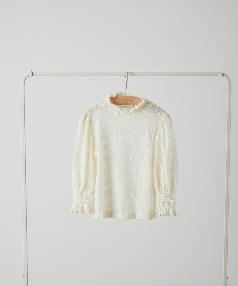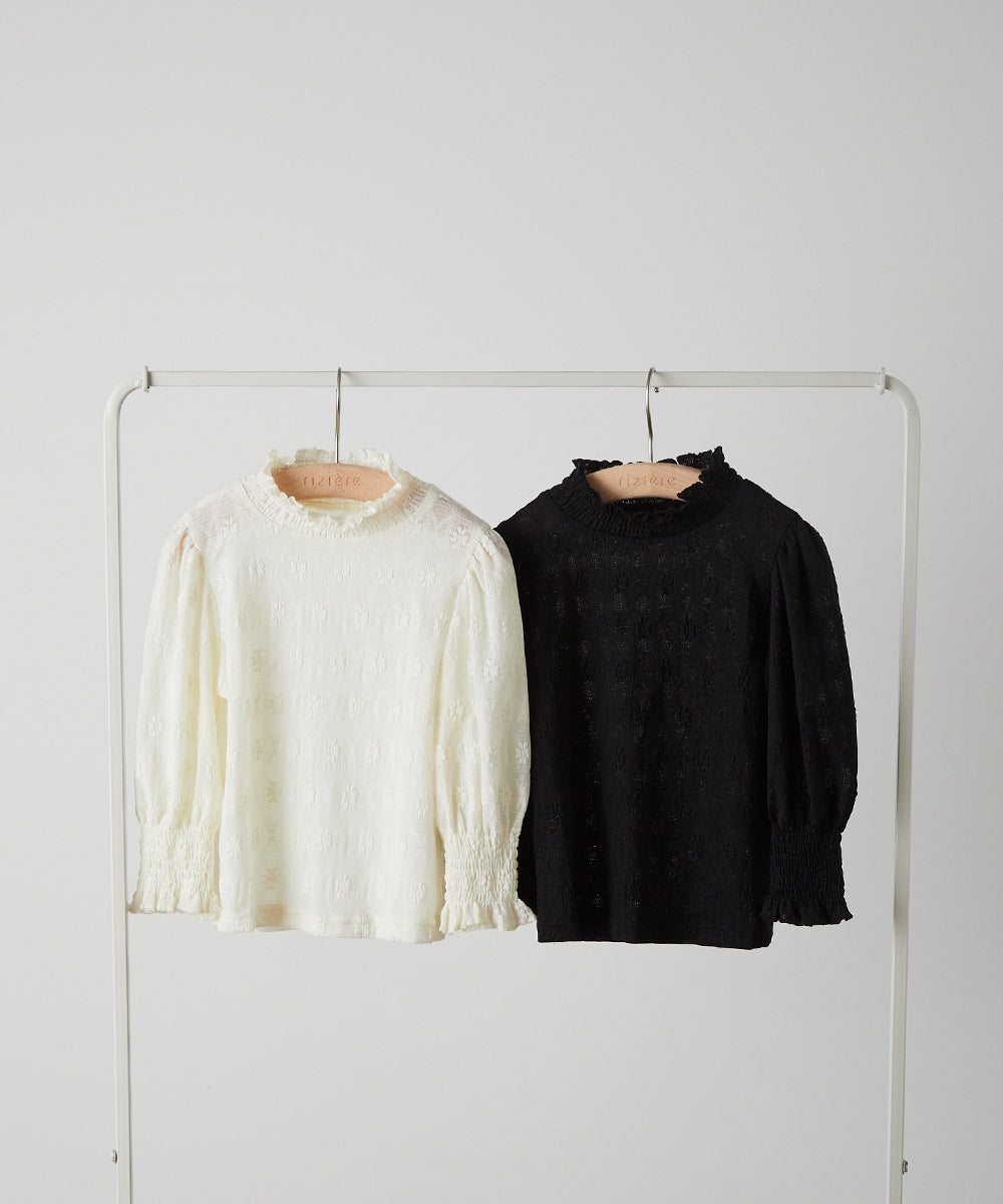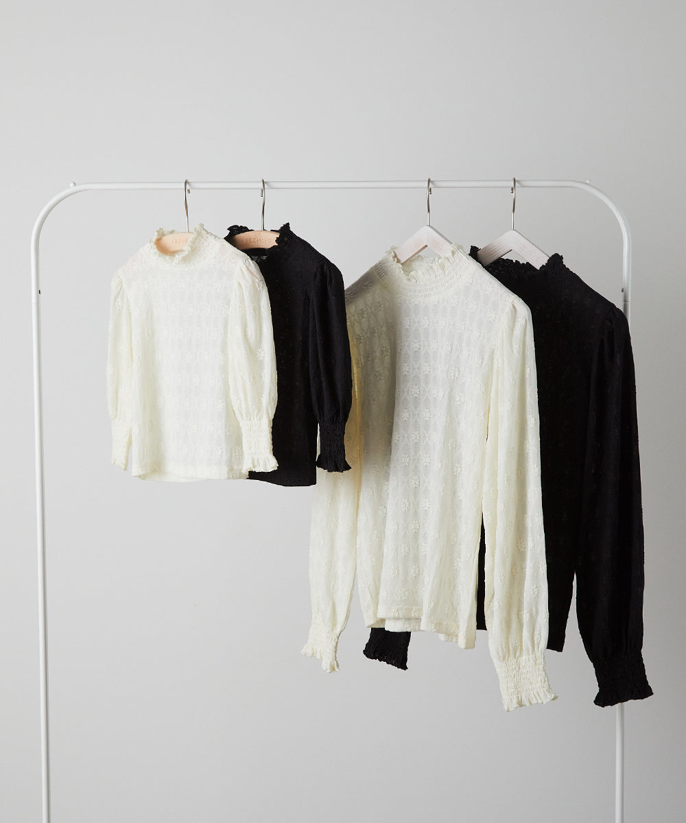 首元と袖口にシャーリングが施されているので着脱しやすく、メインでも、インナーとしてもお使いいただける1枚。