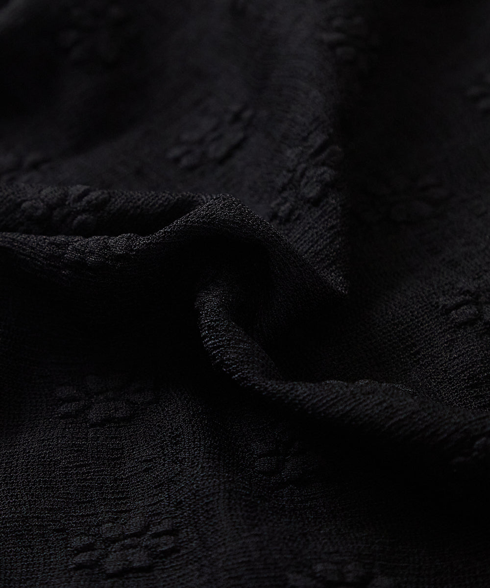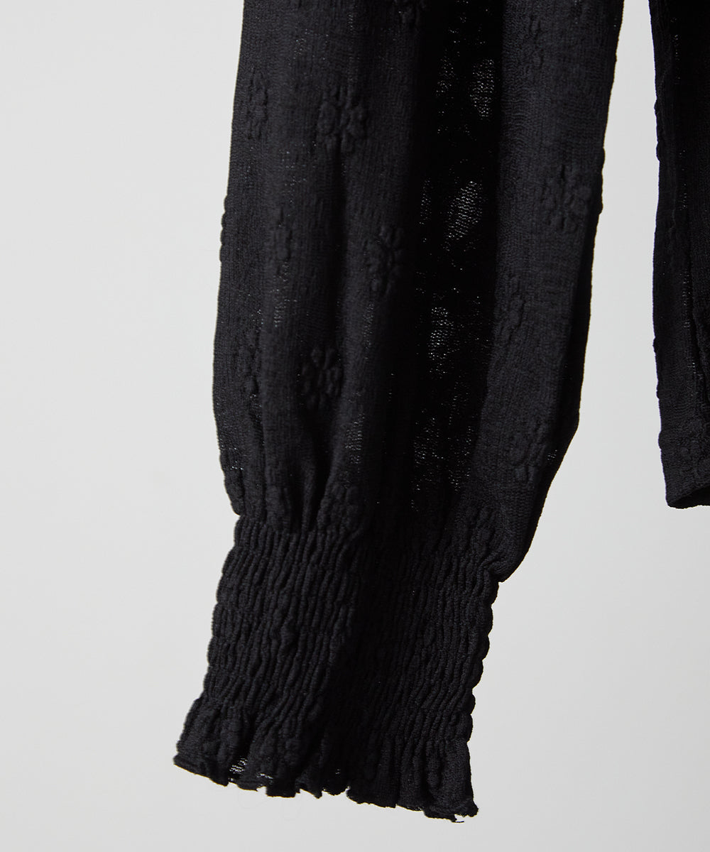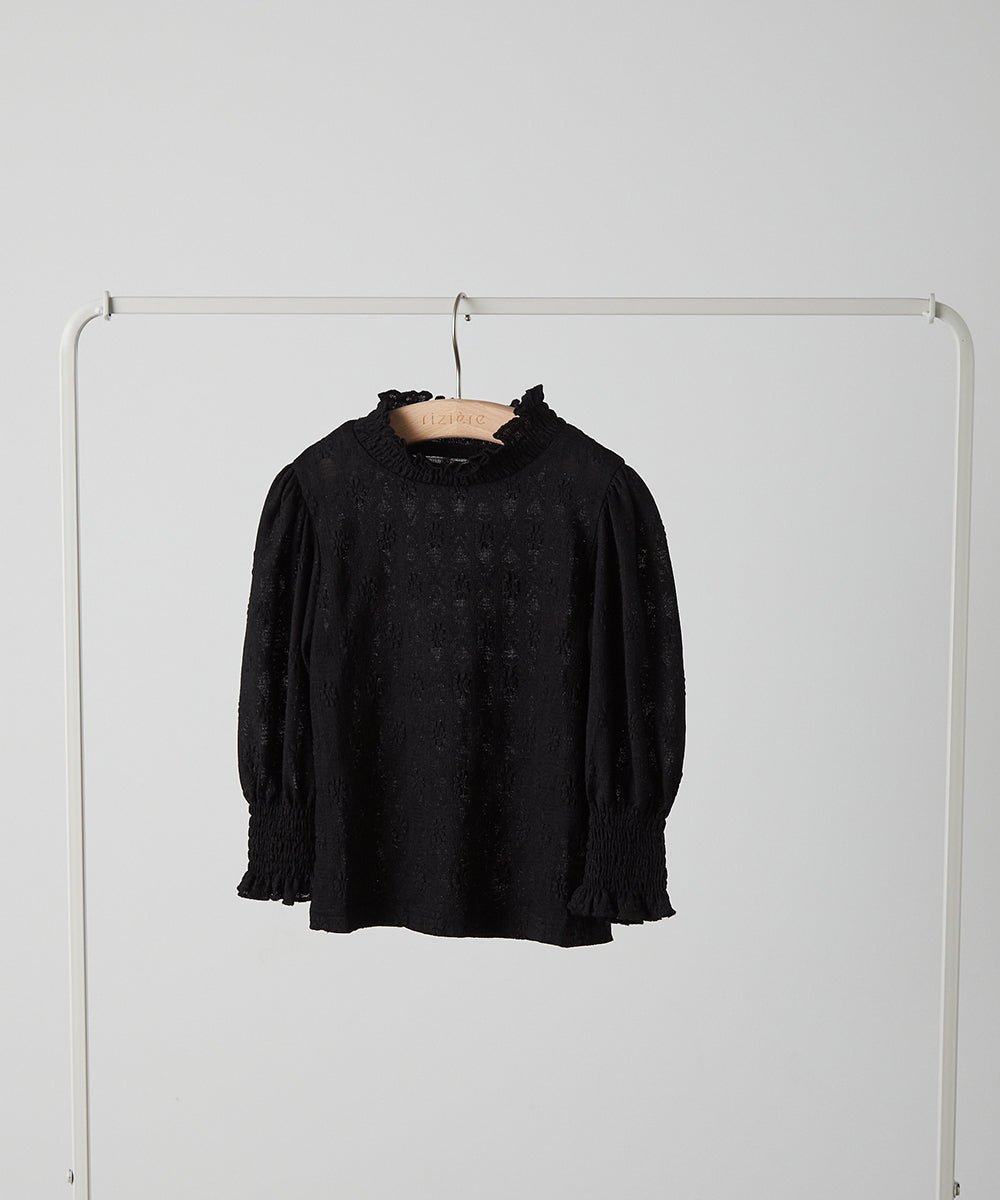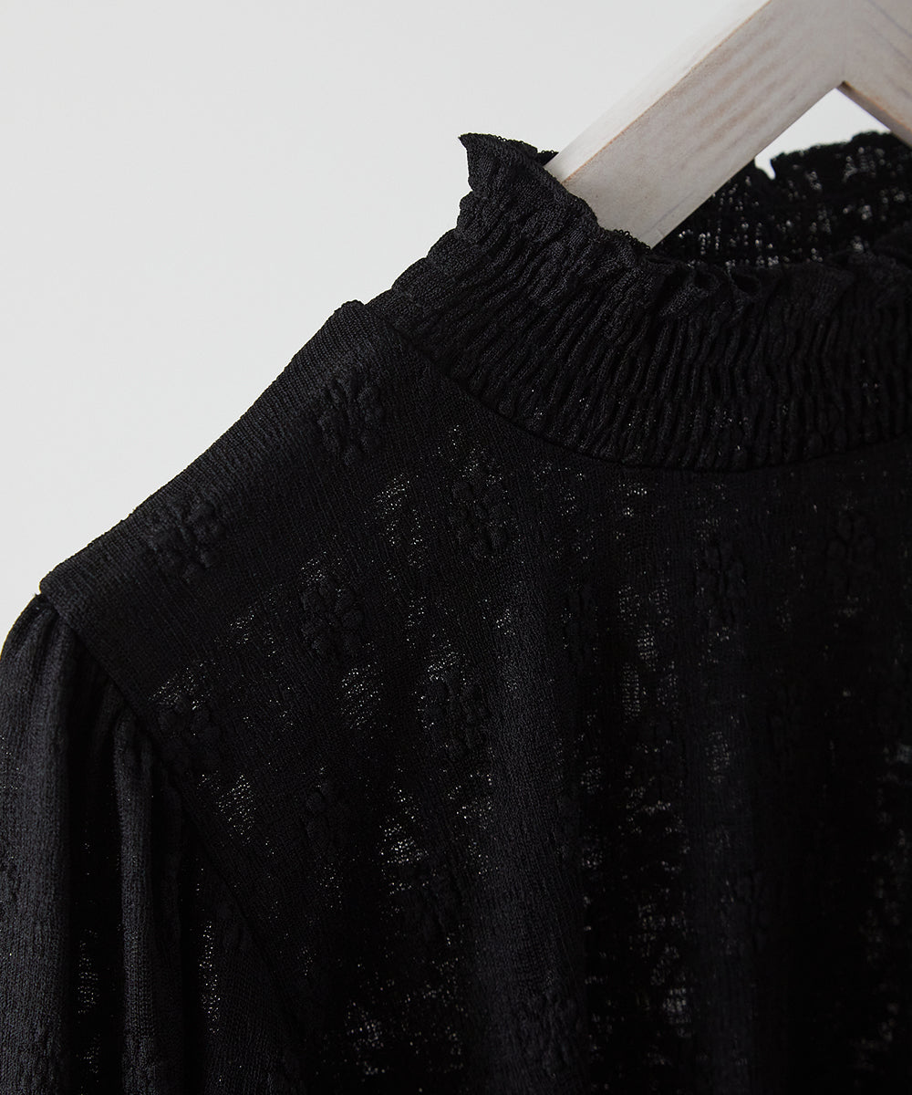 首元と袖口にシャーリングが施されているので着脱しやすく、メインでも、インナーとしてもお使いいただける1枚。