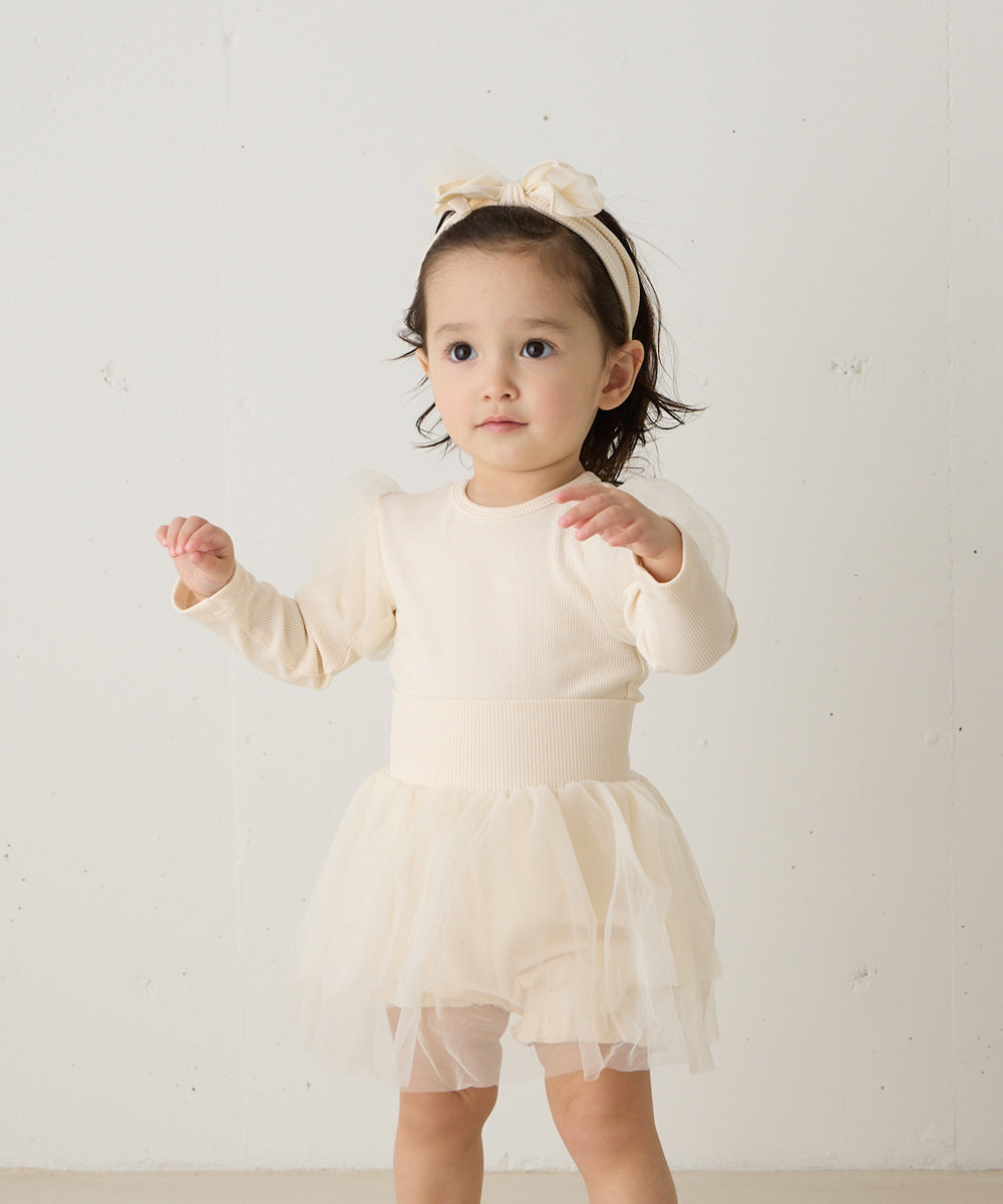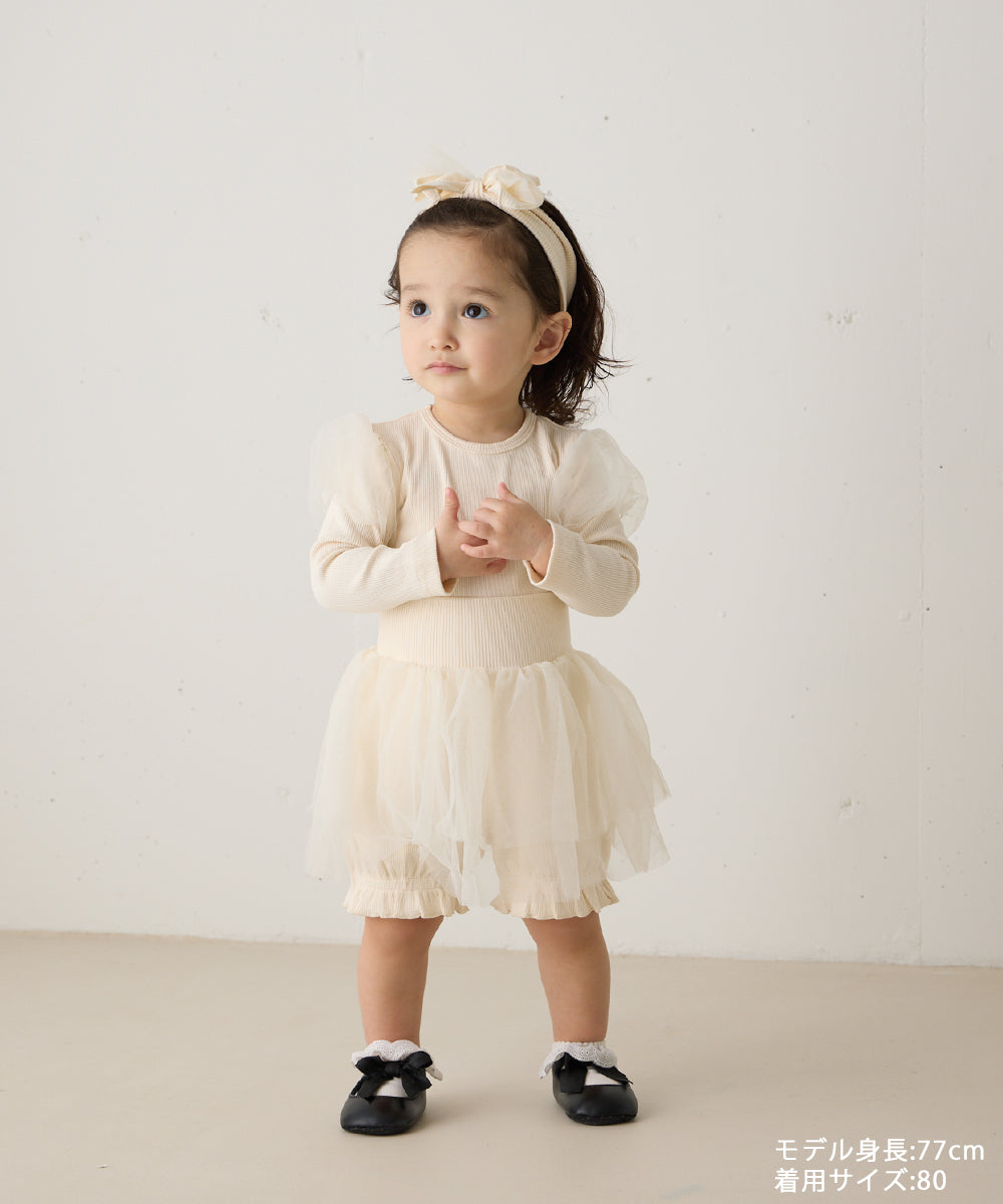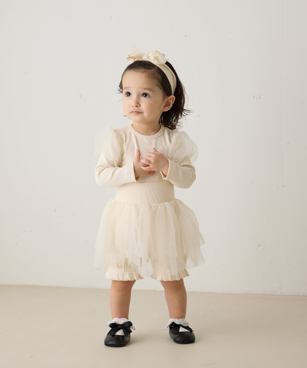チュールのパフスリーブが可愛いロンパースと、ふわふわチュールのブルマ、同素材のヘアバンド、全て合わせて着るのはもちろん、別々にもお使いいただけます。