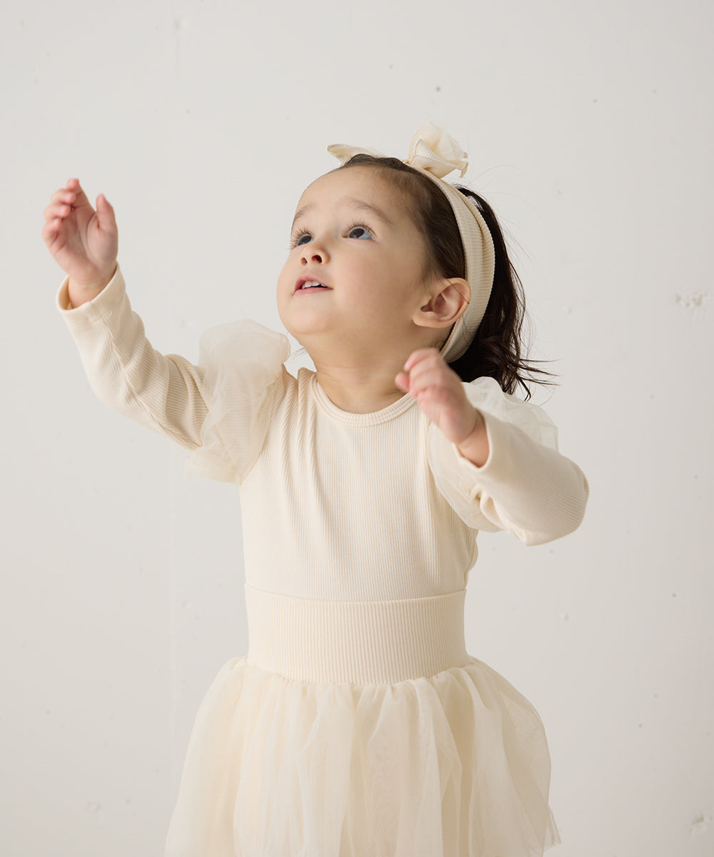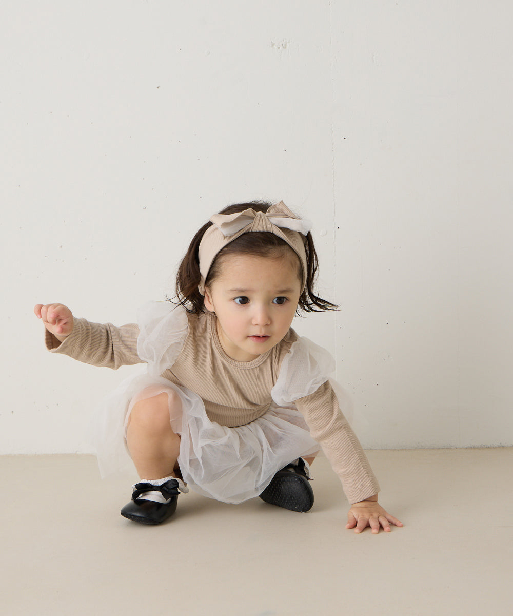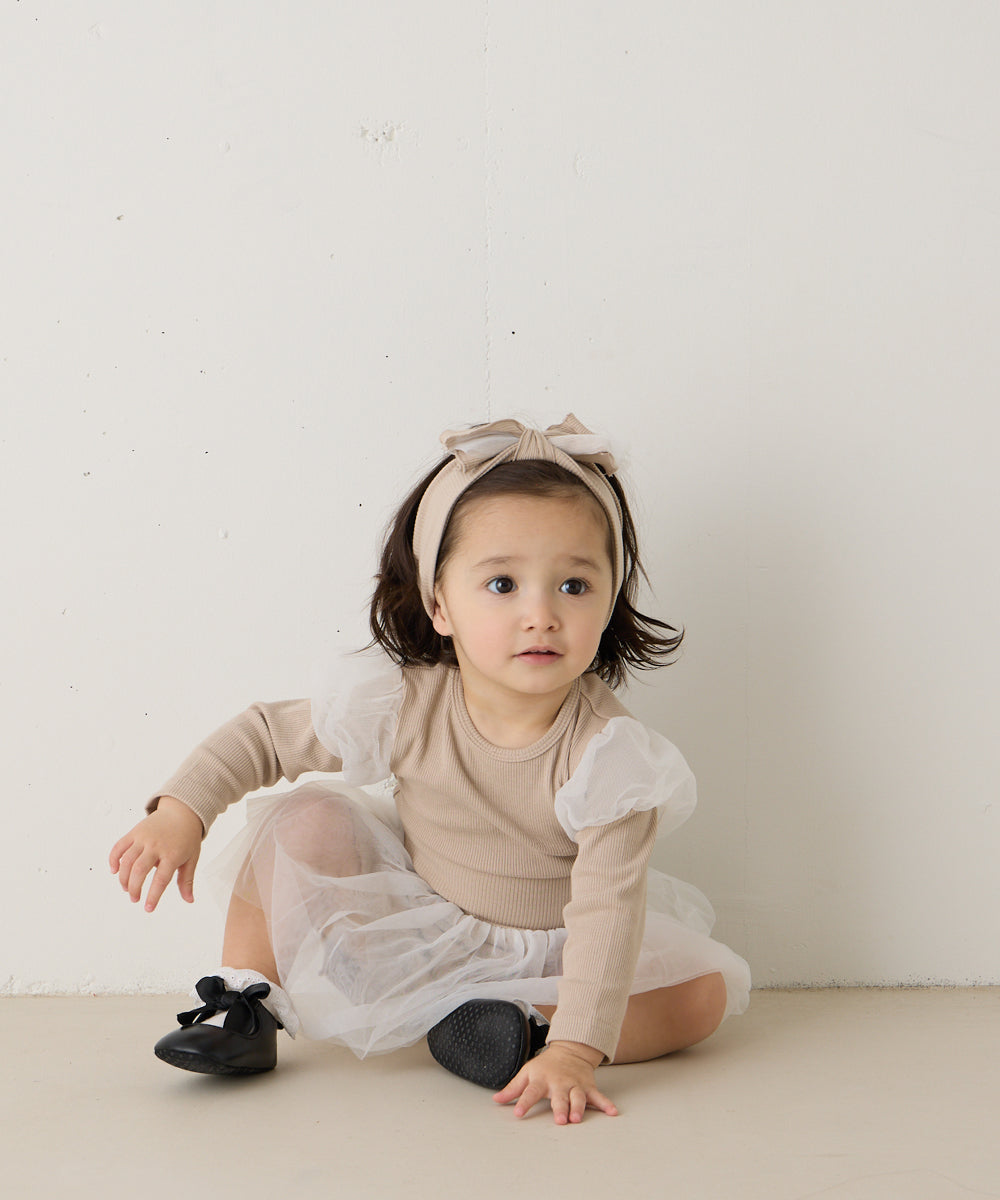 チュールのパフスリーブが可愛いロンパースと、ふわふわチュールのブルマ、同素材のヘアバンド、全て合わせて着るのはもちろん、別々にもお使いいただけます。