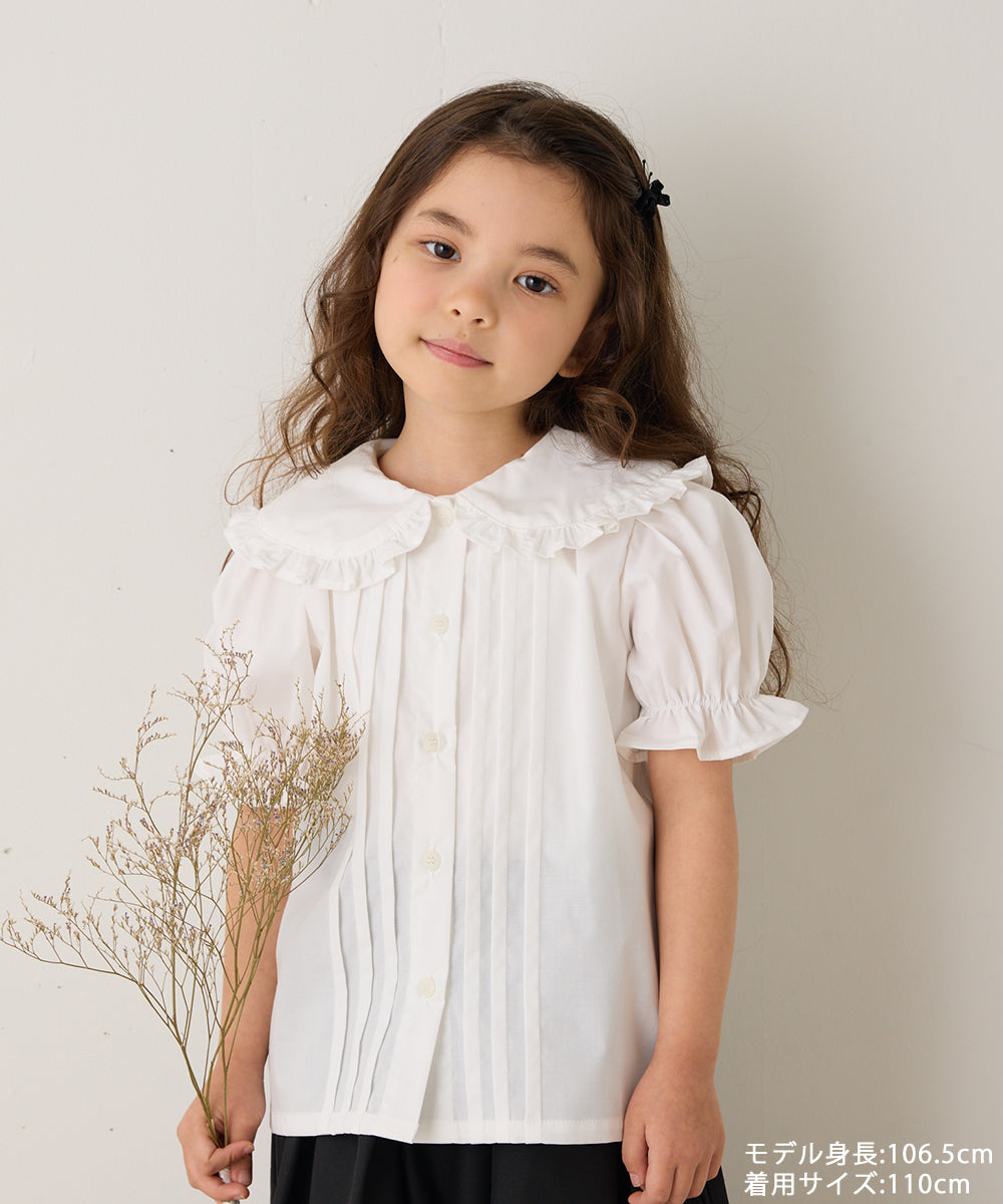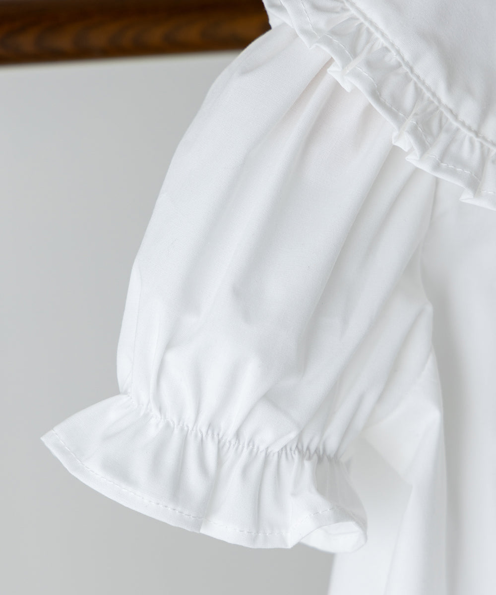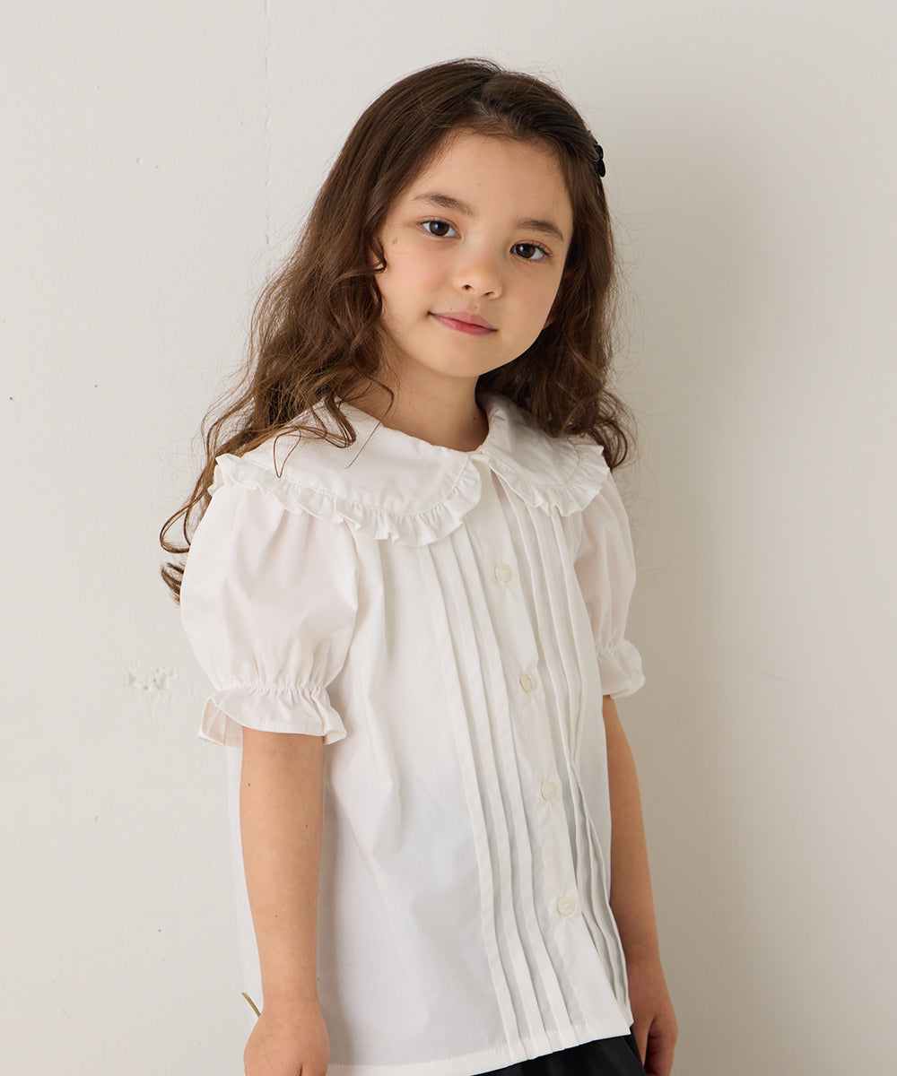 顔まわりをやさしく彩る、フリルカラーが印象的な半袖ブラウス。