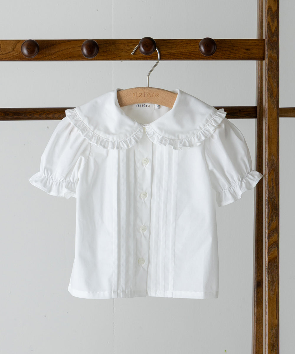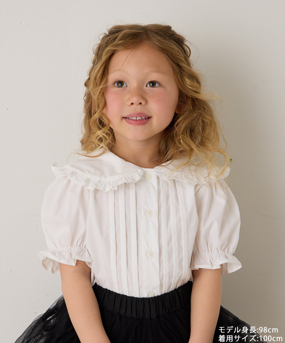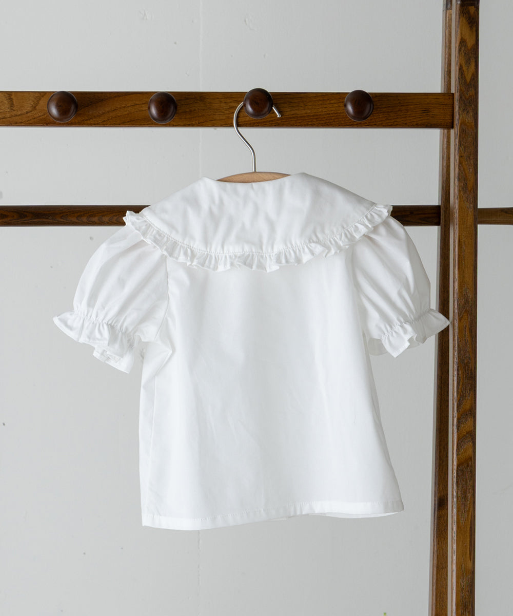 顔まわりをやさしく彩る、フリルカラーが印象的な半袖ブラウス。